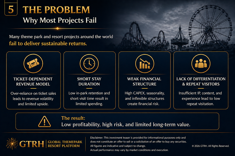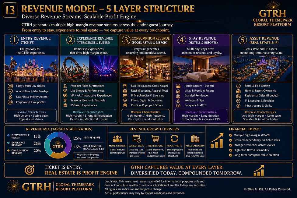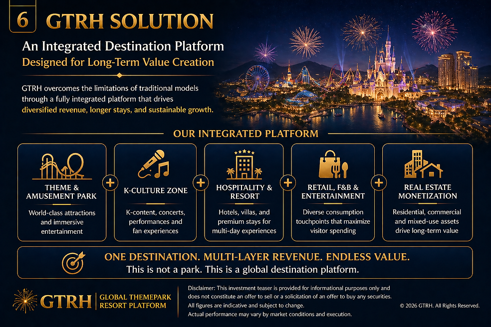 GTRH has not been designed as a conventional single-asset theme park. Instead, it represents a next-generation, fully integrated, four-season mega resort ecosystem combining a Global Theme Park, Amusement Park, K-Culture Zone, hospitality assets, residential communities, and indoor/outdoor retail and entertainment districts across a secured 3.0 million sqm master site, with an additional 3.0 million sqm expansion capacity. This diversified asset composition creates multiple independent revenue streams operating year-round, materially reducing seasonality risk while providing stable, institutional-grade cash flow visibility